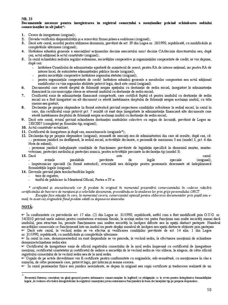 Pentru obţinerea certificatului de avizare sunt necesare urmatoarele documente Procesul de schimbare sediu social presupune inregistrarea unei mentiuni in acest sens la oficiul registrului comertului. De exemplu, la schimbarea sediului social in bucuresti, modificare actelor necesare trebuie facuta de un judecator de daca aveti nevoie de informatii legate de schimbarea sediului social sau despre cerintele care trebuie intrunite la.