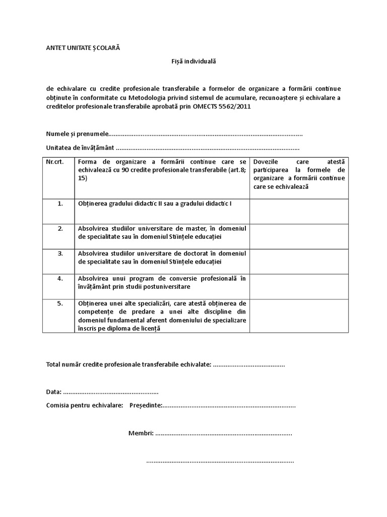 Evaluarea și validarea achizițiilor dobândite de personalul didactic, de conducere, de îndrumare și de control prin diferite programe și forme de organizare a formării continue se realizează pe baza sistemului de acumulare, recunoaștere și echivalare a creditelor profesionale transferabile. Depunerea dosarului de echivalare și acordare a creditelor profesionale transferabile la unitatea școlară, de către absolvenții programelor de formare la școala unde. 3859/03.10.2019 privind echivalarea și acordarea unui număr de credite profesionale transferabile, personalului didactic care a finalizat programe speciale.