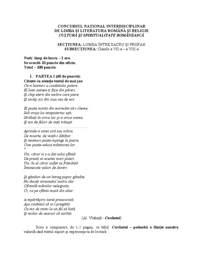 Citeşte, cu atenţie, textul de mai jos: Premii_cultura si spiritualitate romaneasca_faza jud._martie 2015. Concursul național interdisciplinar de literatură română și religie „cultură și spiritualitate românească valorifică personalitatea culturală deschisă, flexibilă a elevului capabil de performanță din învățământul preuniversitar.