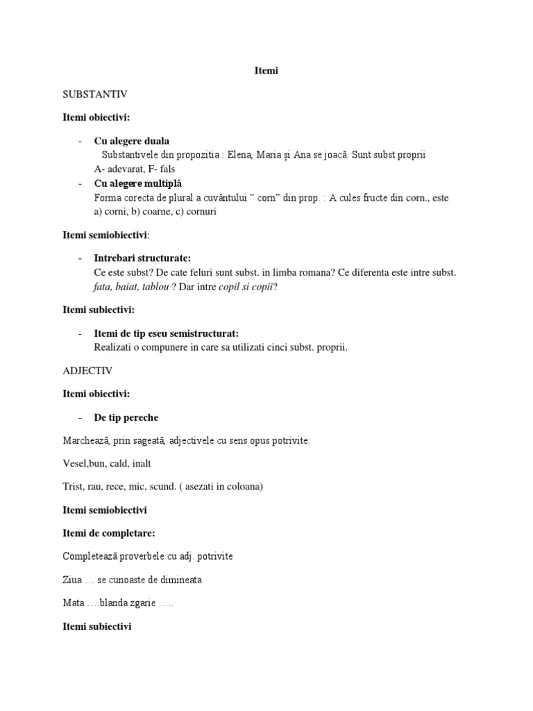 vizitati articolul complet aici : https://ro.scribd.com/doc/18752497/Tipuri-de-Itemi-Evaluare Itemii obiectivi sunt de trei tipuri : Itemi cu alegere duală elevilor li se cere să asocieze unul sau mai multe enunuri cu una dintre variantele: Integritatea și corectitudinea setului de selecții (pentru itemi cu.